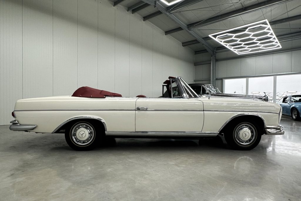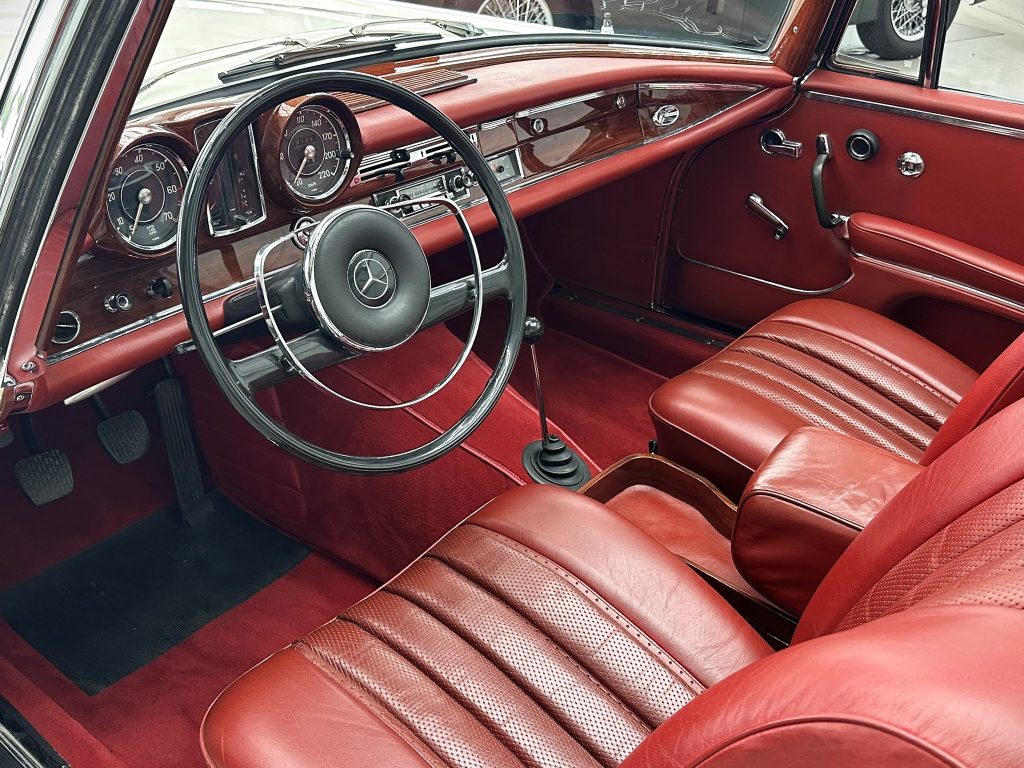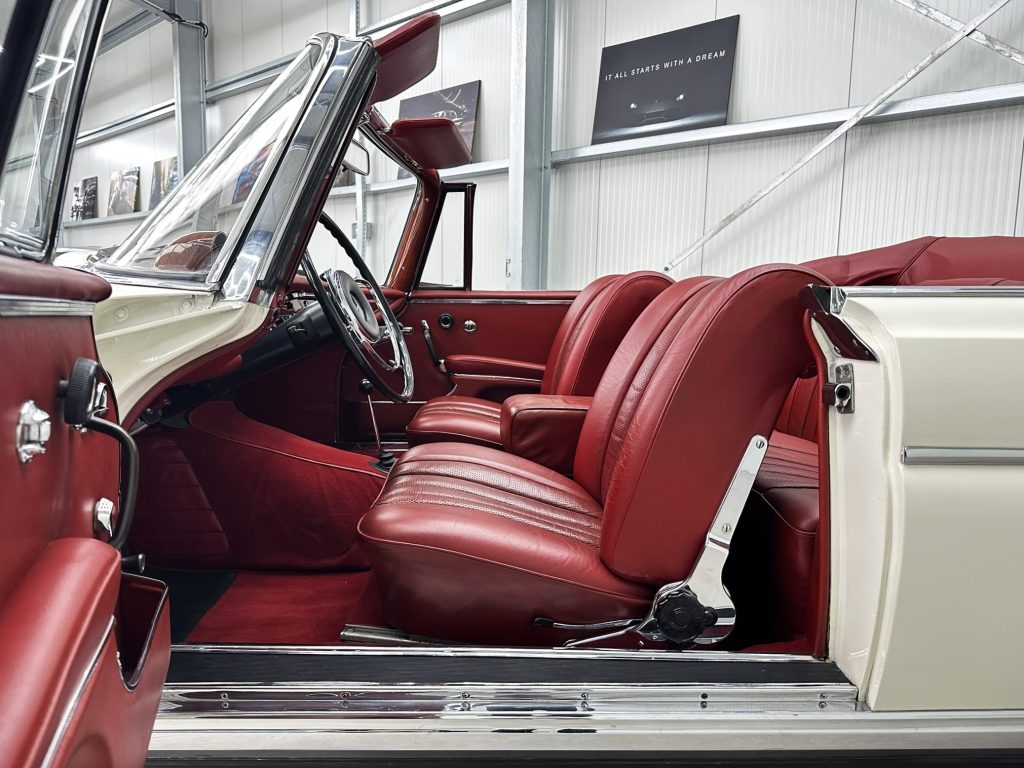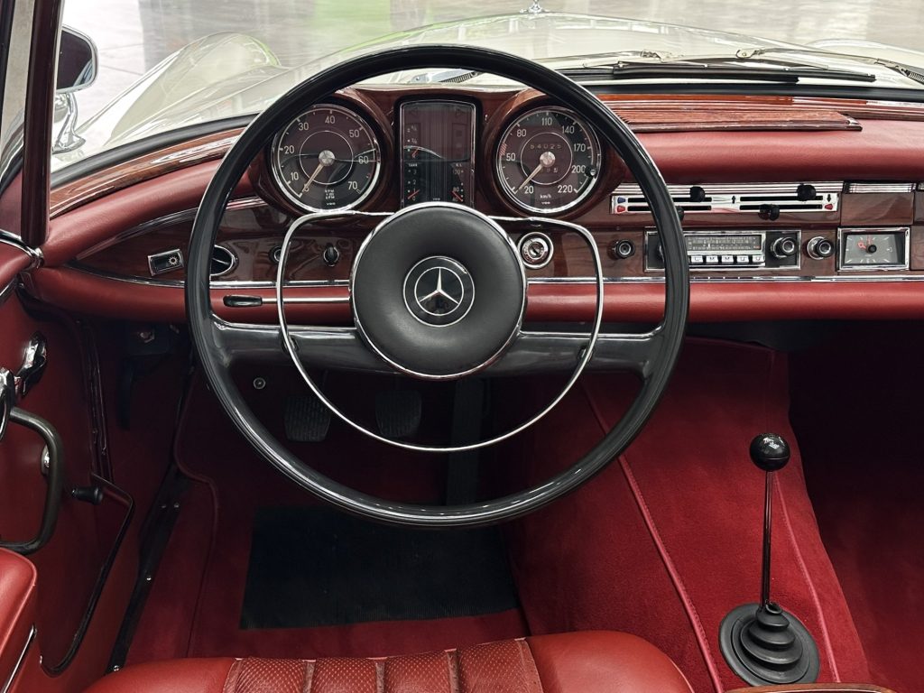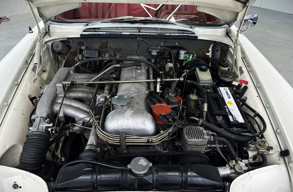 Der Wagen erhielt vor Jahren eine Komplettlackierung in Mercedes-Weiß (050) und befindet sich ansonsten in ausgezeichnetem, originalem Erhaltungszustand. Die roten Ledersitze präsentieren sich mit der gleichen Patina wie bei Masons ersten Ausfahrten, denn der Klassiker stand stets trocken und wurde regelmäßig gewartet. Die hydraulische Niveauregulierung des W112-Fahrwerks garantiert höchsten Komfort, während die 185 PS und die mechanische Einspritzung souveräne Autobahnfahrten ermöglichen. Das original verstellbare Verdeck schließt dicht und schützt zuverlässig vor Regen und Wind.